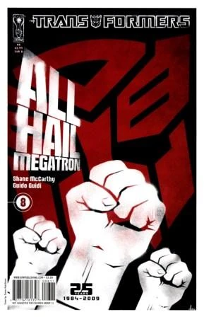 - Cover B: puños humanos levantados frente al símbolo Autobot; arte de Trevor Hutchison.