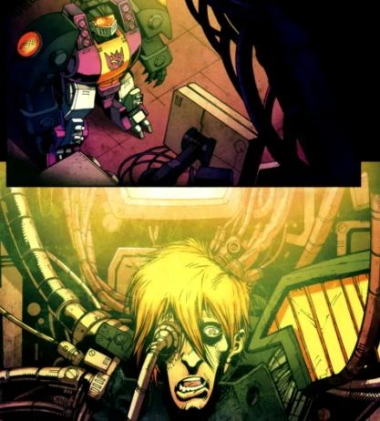 En la Tierra, Bombshell observa a Hunter O'Nion, cuyo cuerpo ha sido desensamblado como una imagen de pesadilla, con numerosos cables entrando y saliendo de su torso, y un tubo saliendo de la cuenca de su ojo derecho; una expresión horrida muy similar a como fue Sunstreaker cuando estuvo bajo los experimentos de Maquinación.