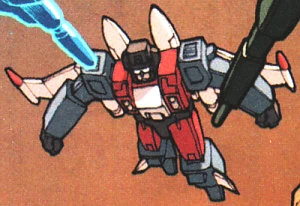 Слагслингер трансформируется в кибертронский истребитель. Он вооружён бластером.[2]