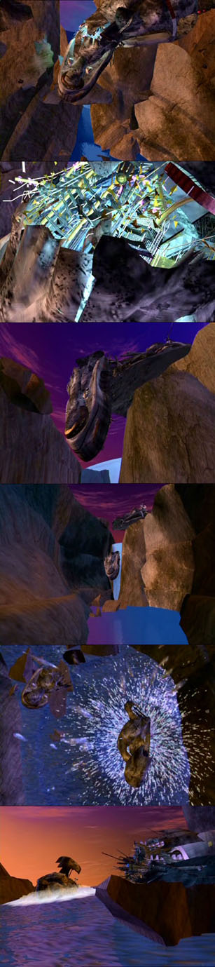 After Megatron's attempt to alter history, she was further destroyed by Predacon forces, as Rampage and some of Tarantulas's spider drones pulled her off the cliff that she was straddling. The ship's forward quarter, including the command center, split off and fell first, landing on dry land. The remainder, including her drives and primary computer center, fell afterward and sank into the lake. The remains of the command center were salvaged to help fortify the Ark against Predacon attack. Optimal Situation Rattrap would later undertake a dangerous mission below the lake's surface to salvage the Sentinel shield control module; a simultaneous underwater battle between Rampage and Depth Charge sent the ship's remains plummeting even further into the lake's depths Changing of the Guard.