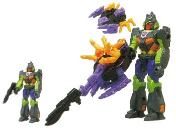 Banzaitron [sic] is a high-ranking officer in the Decepticon Secret Service, possibly the director of the entire organization. He seems to possess a good deal of autonomy from Megatron in carrying out his actions. Banzaitron acts as the handler for Dealer, an unscrupulous Autobot who turned mercenary, selling secrets and services to the Decepticons for profit. Banzaitron attempted to acquire a legendary oracle called "the Magnificence" with Dealer's help, but the operation failed. Spotlight: Hot Rod Dealer's cover ultimately remained intact, however, and he maintained contact with Banzaitron, selling him bits of information such as the existence of Transformer gestalt warriors discovered by the Autobots. With "Doubledealer's" information, Banzaitron tracked them to the penitentiary on Garrus 9 and staged a full scale assault on the Autobot base to acquire this revolutionary technology. After an opening mass bombardment, Banzaitron sent the Combaticons down in a dropship, and his soldiers successfully pulled the six Monstructor component robots out of Garrus 9 using an orbital pick-up. Spotlight: Arcee