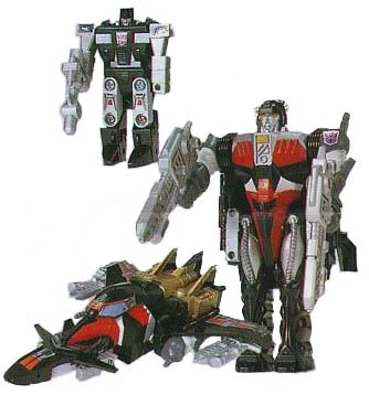 - Black Shadow is a redeco of the Pretender Thunderwing, transforming into a Cybertronic jet. His outer Crossformer shell's chestplate/head piece is retooled from Thunderwing's to make it more robotic. However, it still transforms into a larger Cybertronic jet like the original version. The inner vehicle can be attached underneath the nose of the larger vehicle to create a combined starship mode. All three of his guns can be mounted on his shell's vehicle mode.