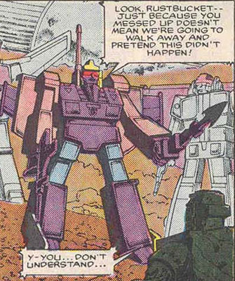 Later Blitzwing and Astrotrain were both held captive by Chumley. To add insult to injury, Chumley told them that he would rather have the help of an aardvark than that of a Decepticon. Ouch. Once Optimus Prime was nearly upon Chumley, Chumley asked the two Triple Changers if he released them, would they would fight Optimus for him. They told him to trust them. However they decided it would be more fun to flatten Chumley. Then Blitzwing gave Chumley some good advice, "Never trust Decepticons, flesh creature!" Once the Autobots were freed, Blitzwing retreated along with Astrotrain, leaving Chumley in an unflattened condition. Prime Target, Cosmic Rust