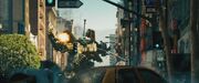 Damaged, but not down, Brawl fired two rockets at Ironhide from his remaining launcher, missing the heavily armed Autobot as he somersaulted over the missiles. Ironhide and Jazz managed to fire several shots at Brawl, disorienting him. Ratchet followed up by using his buzzsaw to slice off Brawl's left arm. The humans then fired a volley of sabot rounds while Ratchet supported with suppressive fire, knocking Brawl to the ground and seemingly killing him.