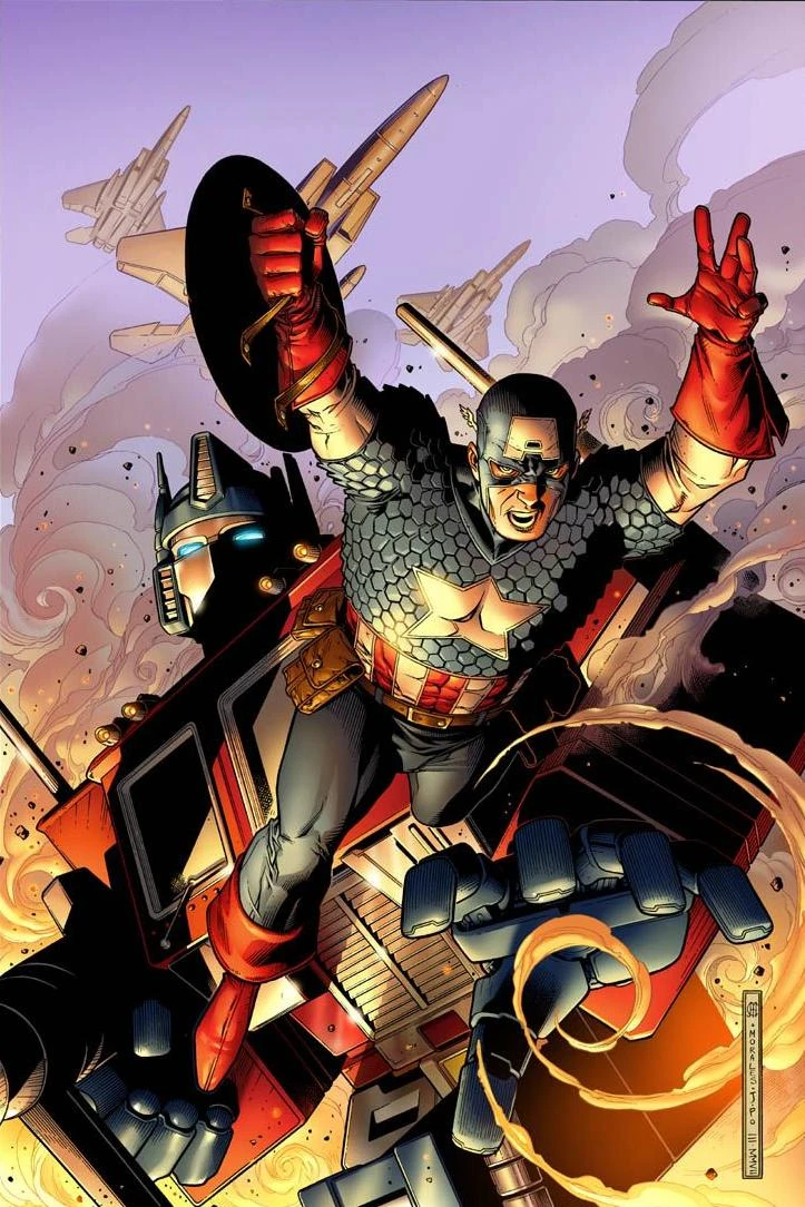 Captain America flew the Avengers' Quinjet into battle with the Decepticons' aerial forces, but soon found himself overwhelmed. With Iron Man's assistance, Cap, Falcon, and Ms. Marvel managed to ground the fliers, but found that their efforts had been in vain when Megatron and Doom annaounced that they had joined forces and taken Ratchet, Prowl, Spider-Man, and Luke Cage hostage, vowing to kill them if their teammates did not surrender. Cap sided with Bumblebee in his willingness to sacrifice the hostages to prevent a Symkarian-Latverian war, but Optimus Prime proposed another solution... Man and Machine, Part Three