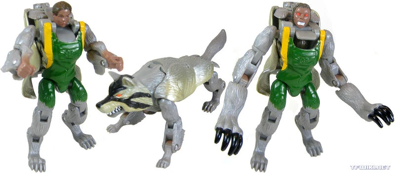 Part of the first wave of Animorphs toys, Cassie transforms from what is evidently supposed to be a human into a wolf, as well as a transitional third mode combining features from both. Like many Animorphs toys, she has a pair of wolf claws that attach to her hands like gloves; unlike the other toys, they are not actually necessary to complete her wolf mode (as it has four paws already), though they can still be used in that mode.