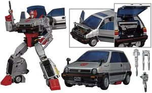 MP-53+ "Senator Crosscut" (romanized "Senatorcrosscut" on the packaging and packaging materials) is a redeco of MP-54 Reboost, which itself is a retool and redeco of MP-53 Skids, and transforms into a fully-licensed Honda City R. He is accompanied by his "Clutch Drone", redecoed from Reboost's Component X, a Honda scooter that can store in the trunk of the vehicle mode.