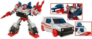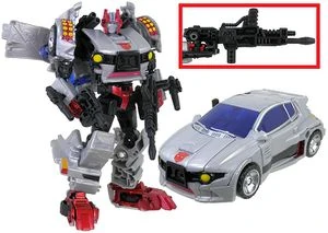 Released in the second wave of Legacy: Evolution Deluxes (fifth wave of Deluxes for the entire Legacyline), Crosscut is a redeco of Legacy Skids, using the "battle mask" head sculpt from Diaclone Universe Burn Out. He transforms into a compact car legally distinct from a Honda City Turbo. He comes with a rifle, a twin-blaster, as well as a translucent-blue Energon rifle that doubles as an axe (though the instructions make no note of using it this way). The three weapons can combine to form a super weapon, now dubbed as an Evo-Fusion ability.