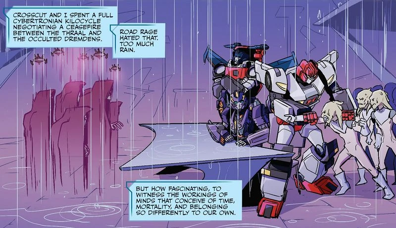 Some time later, he helped run Swerve's (fake) "Crewditions" Towards Peace and took prospective new crewmembers Riptide, Nautica, Mirage, and Nightbeat on a tour of the Lost Light. No Guns, No Swords, No Briefcases He also began working on an experimental one-act, single stage play about information creep (called, unimaginatively, Information Creep) but didn't have time to write the play before he, and every other original crewmember of the Lost Light, vanished. Twenty Plus One