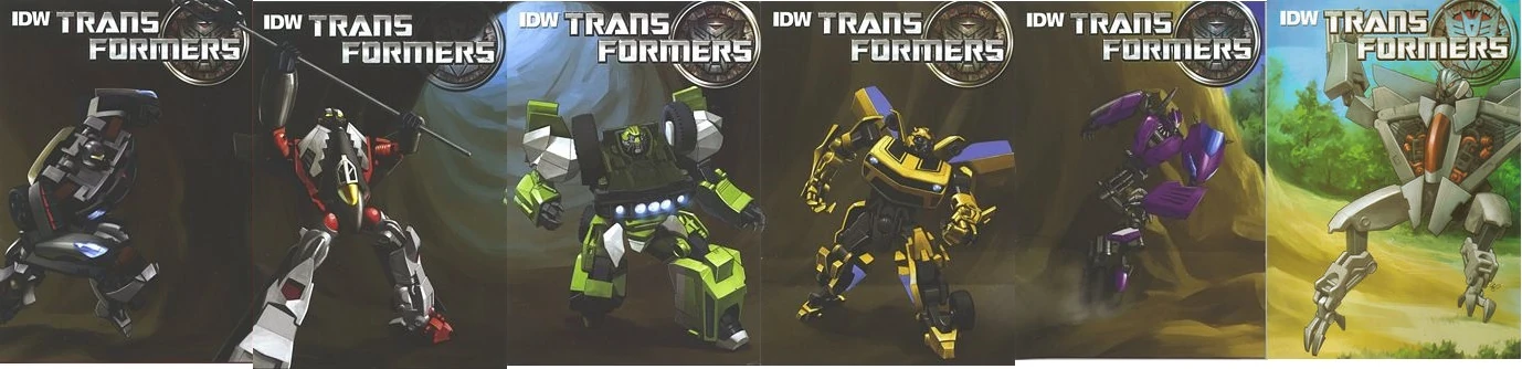 The Cyberglyphics pack-in comics is a 6-part comic series published by IDW Publishing as pack-in material for the Target-exclusive Dark of the Moon toys. The toys that come with the comics are Cyberglyphic-themed redecos of pre-existing molds. Each comic is titled only Transformers, with the cover depicting the character in which the issue comes packaged with, and much like the Foundation retailer incentive exclusive variant covers, each issue cover can combine to form a panorama of the central characters of the series, revealing its chronological order. The story chronicles Space Case's encounters with the Autobots and the Decepticons, bridging the gap between Nefarious and Rising Storm.