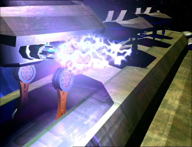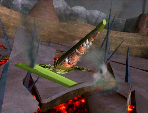 However, Megatron would not have long to gloat, as several well-aimed plasma cannon shots from the Axalon strafed the hull of the Darksyde, crippling the ship and shattering off its (from top) left wing as it plummeted down to the planet's surface along with the Axalon. Beast Wars (Part 1)