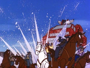 In the country side, Prowl, Jazz, Red Alert, and Inferno find that a group of old west outlaws have encountered a biker gang. After a brief rustle between the two gangs, the Autobots force the outlaws back through the wormhole. Resuming their analysis at Autobot HQ, Chip learns that the disturbances can be traced to Dinobot Island. Optimus Prime orders his team to fly there using jet packs.