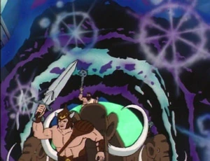 Meanwhile, the Autobots finish repairing the control room. However, Teletraan I alerts them to a temporal anomaly near the library where Spike and Bumblebee are. While going to investigate, the Autobots find barbarians making a mess of things. Hound locates Spike and Bumblebee under the rubble of the library, where Sideswipe drills them out. Bumblebee is able to cover Spike and prevent any harm, while the Autobots round up the time displaced Viking barbarians and woolly mammoths.