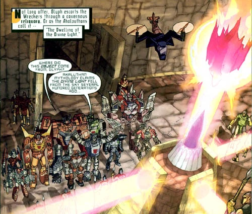 As the Quintessons invented increasingly elaborate devices to control Vector Sigma, one attempt resulted in a strange purple prism. Though the Divine Light would potentially allow a being to circumvent Vector Sigma's interface and harness the power of Primus itself, it was for some reason discarded.