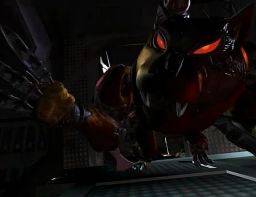 Rattrap, awakened by all the commotion and noise, heads down to the lower level to see to what's wrong. Armed with a firing weapon and a firing weapon only as his best defensive, he is ready for anything that happens Before reaching Cheetor's room, a large, unknown, untamed cat monster goes crazy, bursts wildly out of Cheetor's room and knocks Rattrap over, before rushing away out of the scene and into the night. Optimus comes to help Rattrap, who (incorrectly) assumes that the big ugly monster has gotten Cheetor.