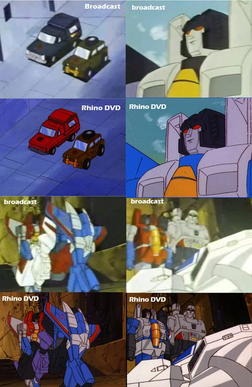 - The Rhino DVD version of this episode uses a number of erroneous takes as the basis of its remastered animation. As a result, the DVD introduces several coloring errors that were not present in the broadcast version. For example, Trailbreaker is colored a solid red (like Ironhide and Sideswipe) in his introductory shot. When Skywarp mocks Starscream for having to guard the Crystal, he is colored like Thundercracker. When Starscream and Thundercracker carry Skyfire’s inert form, the Autobot jet has Skywarp’s colors, and as Megatron addresses Starscream, the latter has Thundercracker's colors. The broadcast version has correct colors for all these shots. (See illustration)