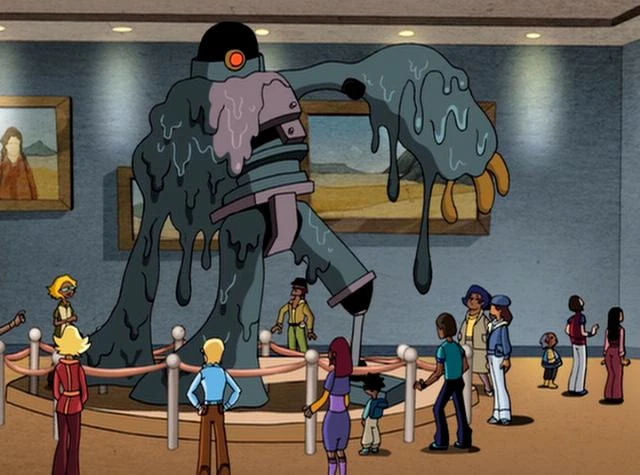 Some time later, the melted remnants of the makeshift robot are relocated to the museum, where they become the centrepiece of Bulkhead's well-attended art exhibition. Looking on Bulkhead's print of the Autobots together, Optimus comments that he finally understands that art is about feeling, due to the emotion he feels looking at it: pride.