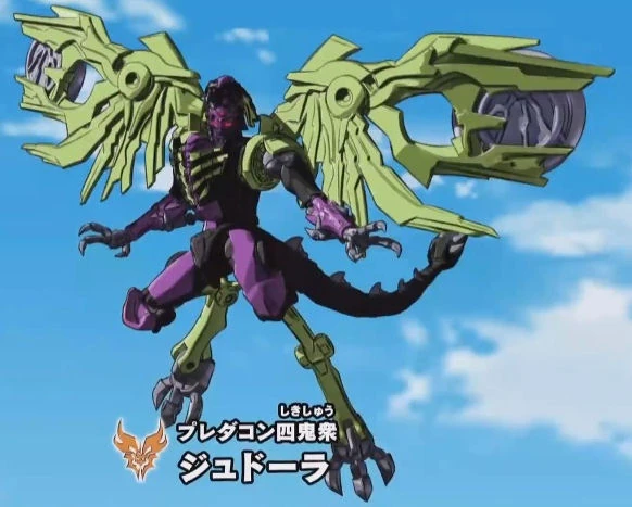 Judora planted a bugging device on Tobio, allowing him to listen in as Optimus Prime briefed the boy and the Swordbot team on the nature of the Legendiscs. He was interrupted in his musings by Budora, and asked his fellow Predacon when Dragotron was going to wake up. Judora and Gaidora went back in time using Dragotron's Legendisc, and tried to snatch the disc Kotarō Fūma possessed only for the ninja to make off through the trees. Finding that the Predacons now faced the Shinobi team, Judora summoned the Jaki, and when the Swordbots easily disposed of them, powered them up into the Black Jaki. Meanwhile, Tobio got hold of the Legendisc and provided the Swordbots with the power to combine, and though Judora powered the Jaki up a second time, they were defeated by the Autobots. GoHishou struck at the two remaining Predacons and a flash of light returned everyone to the present.