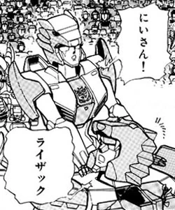 While Leozack (レオザック, re-o-za-kku) is the commander of the elite Decepticon Breastforce and Deathsaurus' most trusted warrior...he really can't be trusted. Leozack is a conniving so-and-so, determined to rise to the highest rank of Decepticon power. All that stands in his way is Deathsaurus. Which, to Leozack's regret, is a hell of a lot to be in the way. His breastplate, the Lionbreast, can detach and transform into a lion-like attack partner or a handgun.
