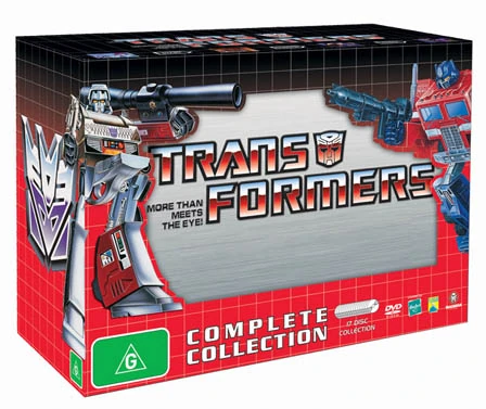 - Transformers: Generation One Complete Collection — Released to take advantage of the nostalgia and interest generated by the live action movie, this set is packaged in a box similar to the Generation One Optimus Prime's toy packaging and features the Generation One boxart images of both Optimus Prime & Megatron, with the disc cases stored in a metal tin. The DVD cases feature IDW incentive cover art by Guido Guidi; an exclusive mini-comic set in 2001 before the animated movie written by Simon Furman, illustrated by Nick Roche and Josh Burcham; as well as a piece of artwork featuring Optimus Prime's Matrix chamber also illustrated by Roche and Burcham. The discs are identical to Madman's previous Generation One release.