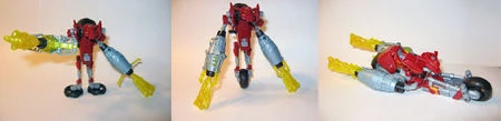 - The Motorcycle Drone was released in the last wave of the Beast Machines toyline, as part of the Battle for the Spark subline. It transforms into a maroon and silver Cybertronic motorcycle, and has both bipedal and wheeled robot modes (the latter of which was featured on the show). It features a missile launcher in the left tailpipe/right arm, activated by pressing on the spark crystal. It hews more closely to the animation model than the Thrust toy released the year before, which may be why it was redecoed as Thrust for release in the Japanese Beast Wars Returns line several years later.