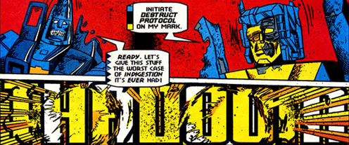 It was. Ratchet reappeared on the Ark fused at a molecular level to Megatron. This wasn't a "pure, strong, and fast" fusion; it was a horrific blending of two mechanoids, both in constant and indescribable agony. Prime managed to subdue the creature, and Autobot medic Fixit took steps to separate the pair, who were then placed in stasis chambers. The Price of Life! During the aftermath, Optimus Prime surrendered his forces, including Nightbeat, to Scorponok's Decepticons on Earth, hoping to use his desperate action to unite both factions against Unicron. This alliance was about to form when the entire Decepticon base imploded in on itself due to an attack from Shockwave's small team of rival Decepticon forces. Surrender! Nightbeat survived this initial strike, and along with Optimus Prime and the other Autobots, emerged and tried to keep the new Decepticon Civil War from spreading beyond the area. Optimus charged himself and Nightbeat with keeping Scorponok specifically out of Manhattan. ...All This and Civil War 2 However, when G.B. Blackrock's team of robot-fighting mutants, the Neo-Knights arrived, Nightbeat was the first to fall at the hands of the psychotic Circuit Breaker. As the fighting neared its end, and the alliance began to form again, Primus teleported the Earth-bound Transformers to Cybertron; Nightbeat's antenna was in contact with the Neo-Knight's helicopter, accidentally bringing them to Cybertron as well! Out of Time!