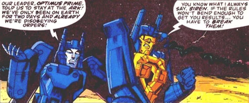 - For their character models, the face/Nebulan and helmet/seat pieces of Nightbeat and Siren were inexplicably switched. (It is difficult to tell for sure, but they may have kept the correct antennae/guns judging by the basic shapes involved.) This switch gave comic book Nightbeat the "shades" he's remembered for, as well as the crest on his forehead, while comic book Siren ended up with his trademark combined brow/nosepiece. How or why this switch happened, and in what stage of development it occurred, is unknown.