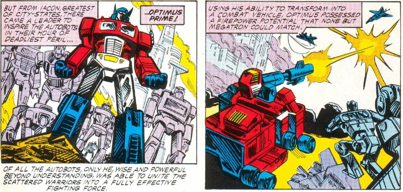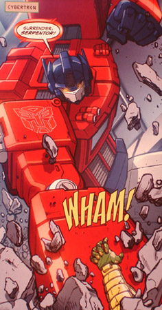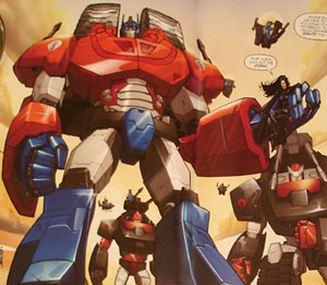 Later, at a peace celebration, Optimus was watching a procession of Autobots when Decepticons attacked. Optimus ordered Omega Supreme into action but the huge Autobot was quickly overcome by Menasor, Piranacon and Predaking. Optimus hopped into the fray, saved a female Autobot from getting smushed by the falling Omega, rode a flying Decepticon into Piranacon’s face, smashed another Decepticon into the ground, and carried a wounded Autobot out of danger.