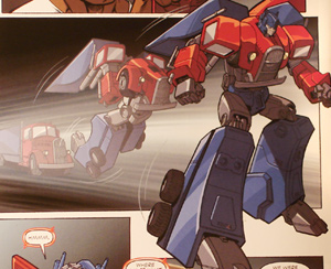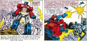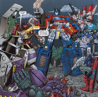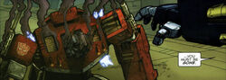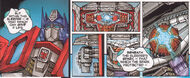 However, Optimus transferred his consciousness into his trailer, leading Megatron to believe him dead. Realizing that Ore-13 was the same as Ultra-Energon, Optimus returned to his body in time to save his forces from the relentless Megatron, blasting him point blank in the face and dealing enough damage to the Decepticon leader to drain his power reserves, just as he did against Thunderwing. The victory was narrow, however, leaving Optimus with the daunting task of fending off an increasing enemy force without his last ace in the hole. Escalation issue 6