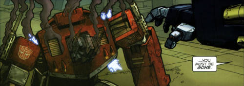 The fight went well at first, with Optimus blowing Megatron's fusion cannon clean off. Megatron, however, tireless thanks to Ore-13, prevailed, almost beating Optimus into stasis lock. Escalation issue 5