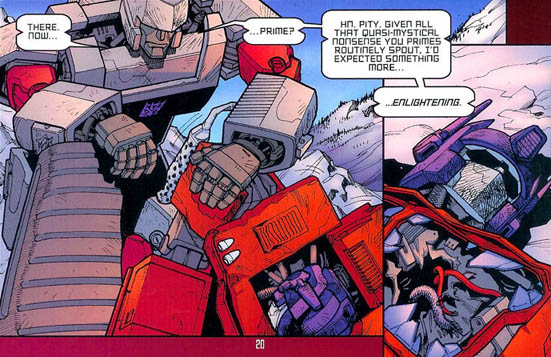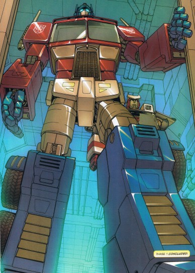 This near-death experience had left Optimus somewhat unsettled. While his consciousness was in infraspace downloading to his trailer, he sensed a presence of dread—the visage of his long-missing predecessor, Nova Prime. Looking for answers, Optimus Prime left Earth temporarily to seek an audience with Omega Supreme for answers. Once there, he found out about Nova's beliefs of how Transformers were a superior race and should remake the universe in their image, and faced down the rampaging Monstructor, a legacy of Nova's tenure locked away by Omega Supreme. Then he gave his "you shouldn't have done that" speech to Omega, handed Monstructor's limbs over to Jetfire's team, and went on to do what comic G1 Primes do best: have angst-ridden introspection about himself and the tarnished legacy of the Prime lineage. Spotlight: Optimus Prime