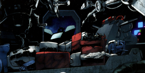 Later repaired by a female nursebot, Optimus went back to finishing his paperwork. A leader’s job is never done. G.I. Joe vs. the Transformers: The Art of War