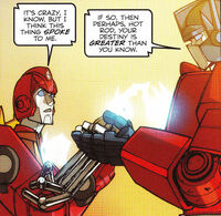 Sensing a new, yet old, danger to planet Earth, Optimus elected to send himself to earth on an investigation, and gave Hot Rod a glare when the young Autobot accused his leader of taking an unnecessary risk to atone for the death of a close friend.