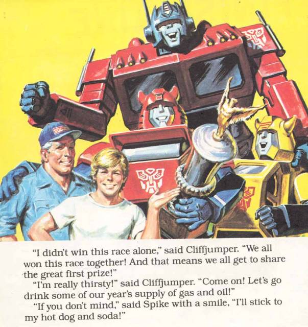 A 2-part race was being held with a massive supply of oil and gasoline as the prize. The Decepticons wanted it badly, but so did the Autobots. Megatron entered the race by hiding himself inside a hollowed-out car, but ended up losing to Cliffjumper after Optimus Prime ripped out a telegraph pole and hit Megatron for a home run. Optimus Prime celebrated the Minibot's victory with a big smile as all the Decepticons starved to death. The Great Car Rally