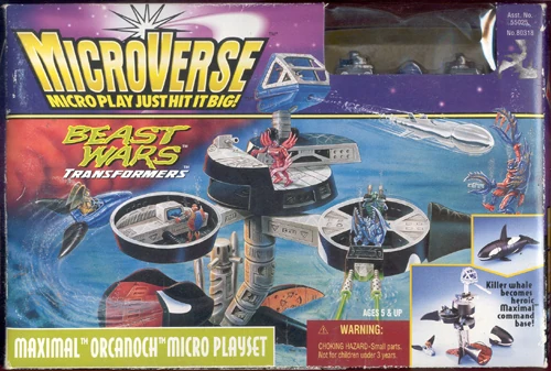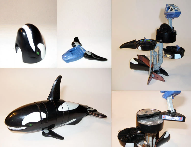 Orcanoch was released as part of the Microverse line, Hasbro’s miniatures line meant to compete with Galoob’s “Micro Machines” (before Hasbro’s purchase of Galoob). It transforms from an orca into a multi-level tower base. Its pectoral fins pull out to reveal a separate one-robot mini-sub. The orca head is removed (and presumably set aside) to reveal a control tower with spring-loaded missile launcher.