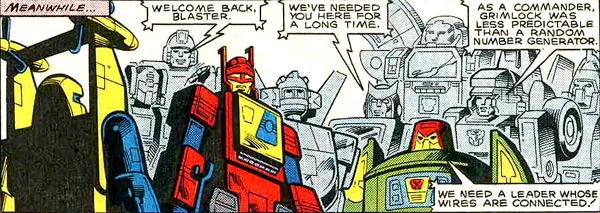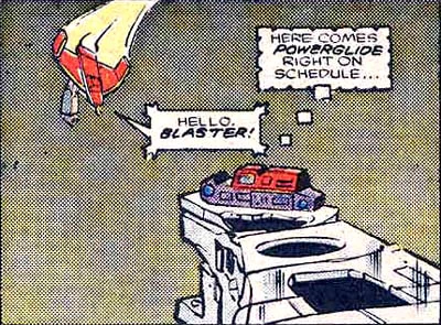 When Optimus Prime died (for real) after a digital battle with Megatron, Powerglide observed with the other Autobots as Ratchet failed to successfully repair their fallen leader. After attending Prime's (real) funeral, a criminal known as the Mechanic turned the Ark's new security systems on the mourning Autobots, with devastating results. Funeral for a Friend! After Grimlock, Prime's successor, turned out to be a self-interested tyrant, Powerglide was among the Autobots who begged the Blaster to overthrow him, but the mutiny didn't pan out. Spacehikers! Later, Blaster and Grimlock battled for supremacy on Earth's Moon, as Perceptor and the other Autobots cheered Blaster on. Totaled!