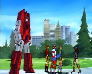 Further reconnaissance by Blaster and Powerglide revealed startling news -- the Decepticons were building a Space Bridge! As this would spell certain doom for both Cybertron and Earth, a desperate raid on Straxus's Darkmount fortress was launched. This attack was mostly successful, as it leveled Darkmount and ended in Straxus's destruction, but he and the rest of his Autobot comrades had to retreat to Earth over the Space Bridge as it self-destructed. Here they were greeted immediately by a group of humans. The Bridge to Nowhere!