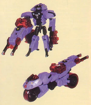 Quickslinger has no official toy. She began as a kitbashed fan character by Shawn D. Tessman, published in the Fun Publications fan club magazine. Basically, she's Cybertron Ransack with the opaque red plastic painted lavender. Also, she has a profile that makes the blue states cringe.