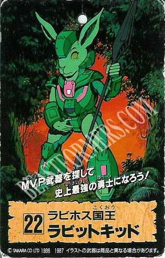 - Rabbit Kid is an anthropomorphic aqua rabbit in high-tech teal and aqua armor. He comes with his "Rapid Spear" double-bladed spear. He has one of three rubsigns on his abdomen, revealing the elemental power of fire, water, or wood.
