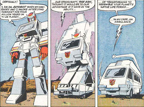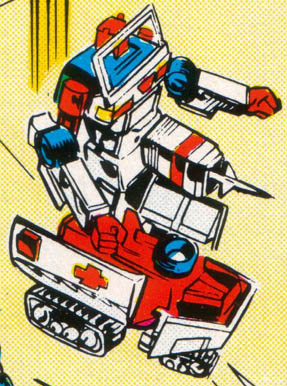 Ratchet served as chief medical officer of the Ark on its mission to seek out new energy sources to fuel the Autobot struggle against the Decepticons. When the Ark was boarded by the crew of the Nemesis, Ratchet attempted to defend his ship by attacking Soundwave, but was thrown into a computer console for his trouble. Ratchet and the other Transformers were forced into emergency stasis lock when the out-of-control Ark crashed into a volcano on a primitive planet. Four million years later, the volcano erupted, activating Teletraan I to rebuild the Autobots and Decepticons. Ratchet was rebuilt into a human-scaled ambulance. After Hound and Cliffjumper's failed scouting mission ended in a counterattack by Laserbeak, Ratchet arrived with Hauler to pull the damaged Hound out of a ravine. Once he finished repairing Hound, Ratchet was part of the battlegroup sent to stop the Decepticons stealing the oil from an off-shore oil rig. However, he did not fare well in this battle. More Than Meets the Eye, Part 1