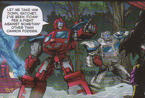 Ratchet soon discovered, to his horror, that he was the last Autobot still functional on Earth, up against the entire Decepticon army. Covertly invading the Ark, he learned that even the mighty Optimus Prime had fallen. However, Prime's head, though detached, still functioned, and the Autobot Commander told Ratchet that he must rise up to meet this challenge. Ratchet did not believe he could; he was a doctor, not a warrior (dammit, Jim). Warrior School!