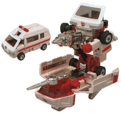 - Ratchet was originally a Onebox Ambulance Type toy from Takara's Diaclone line before Hasbro brought Transformers to North America. The toy transforms from an ambulance to a robot and gun-station. A variant of the toy includes red crosses on the top and sides of the vehicle. Ratchet and his retool/redeco buddy Ironhide, like all Diaclones, were designed to be piloted mecha, which is why he has a seat instead of a head. The Transformers version applied a face sticker to the back of the seat in lieu of a real sculpted noggin.