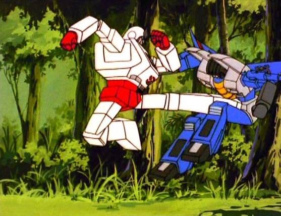 When Starscream and a team of Decepticons arrived on Earth, they attacked the Ark's inhabitants, wanting the starship for themselves. In the initial assault, the Autobots managed to take Soundwave, his cassettes, Thundercracker, and Skywarp prisoner, but eventually all the Autobots but Ratchet and Brawn were defeated by the mighty Bruticus. Expecting a supply ship from Cybertron later that day, Ratchet and Brawn slipped past the Ark's berserk defense systems in order to contact the ship and warn them. Unfortunately, Bruticus arrived soon after, and they were forced to destroy the Ark rather than let the Decepticons have access to Teletraan I. Night of the Combaticons Before the battle could escalate further, it was interrupted by the arrival of Sunstorm, a Seeker seemingly powered by supernatural forces. An uneasy truce was formed between the small group of Autobots and Decepticons, and Ratchet begrudgingly put his medic skills to work on Starscream. Skyfire
