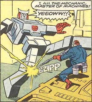 Ratchet and Wheeljack collaborated on a Transformer-sized robotic suit, to be used by Buster Witwicky in battle. Optimus Prime was unamused. Robot Buster!
