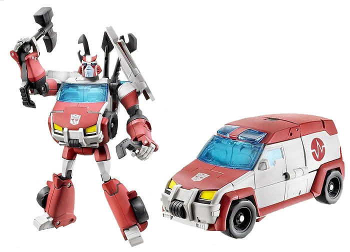 - First shipping in Wave 2, Ratchet transforms into a stylized ambulance. In robot mode, his "magnets" are simulated by spring-loaded pieces in the underside of his forearms that flip up through his open hands. He also features a veritable arsenal of fixit tools that attach to the undeployed magnets to simulate him holding them, so you too can experience the glee of having the old coot savagely beat someone with a servo-wrench. These tools can store in his backpack in robot mode, but cannot be stored in his vehicle mode, a rare (but not unheard-of) instance of a toy made in the last decade with accessories that cannot be "stored" in all modes.
