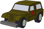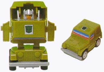 Rollbar makes good use of his low power in vehicle mode. He is a rubber-tired acrobat, able to jump like a cybergoat and run like a turbodeer. This is fortunate; he has little or no firepower, and if caught out has little choice but to run away. He does have radiation and chemical sensors to assist his tracking missions, and audio-video equipment to record his findings, or perhaps the big game.