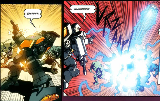 Unfortunately, Runabout was brutally off-lined when the Reapers attacked the Decepticon command bunker in Oregon. He was electrocuted until he exploded, upsetting Runamuck, who was soon decapitated and then had his errant head crushed by a large boulder. Devastation issue 6