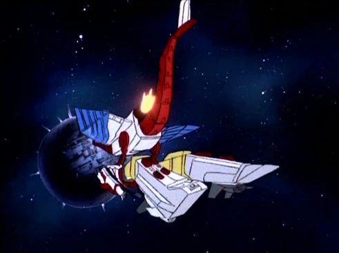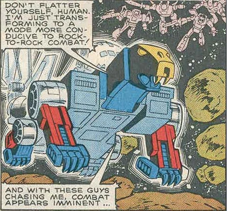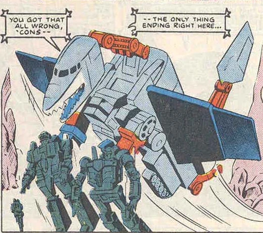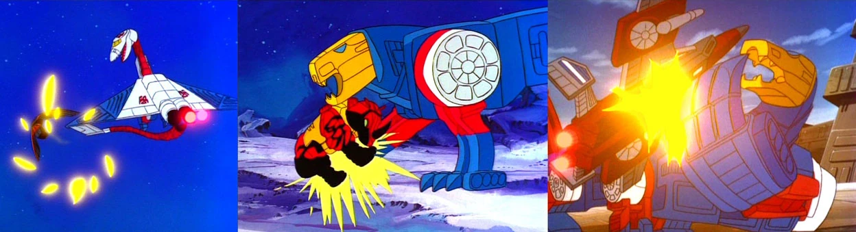 Taking advantage of Starscream's gross overconfidence, Sky Lynx tipped the scales further in his favour by splitting in half into his separate lynx and dinosaur modes, then soundly thrashing the pitiful Combaticons before the shocked Starscream reactivated the energy dampners.