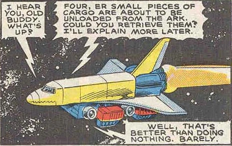 Sky Lynx's old chum Wheeljack, who was no stranger to his brilliance, called upon him to join the Autobots on Earth, where Grimlock's less than stellar performance as Autobot leader threatened to doom them all! (The uncouth Dinobot was overly obsessed with catching the rogue Autobot, Blaster.) Upon the venerable Sky Lynx's arrival, Wheeljack requested that he put his considerable skills on temporary hold. What a waste of his immeasurable potential! Before too long, thankfully, Sky Lynx was at last called into action! After Grimlock tossed some juvenile humanoids out the airlock of the Ark into space (for "conspiring" with Blaster), Sky Lynx, with utmost aplomb, rescued them, and put to use his finest displays of agility evading those mongrel Dinobots. Indeed, Sky Lynx's feats were subverted only by the actions of another. To wit: While Sky Lynx was surrounded (which posed no true disadvantage to the ever-resourceful paragon), Blaster turned himself in to Grimlock in exchange for the guaranteed safety of Sky Lynx's young charges. Spacehikers!