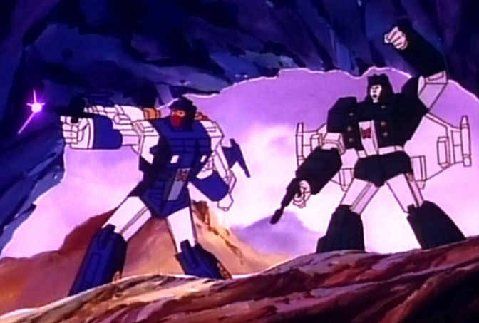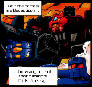 Despite the Decepticons managing to capture several Autobots, when their friends arrived with their new-fangled Headmaster technology, the Decepticons had their asses handed to them. Slugslinger got a lucky break, being a jet, when the Decepticons met up with the Hive: Cyclonus didn't offer their new partners his head. Instead, he was partnered with Caliburst, a Hive member who was equally inept at warfare. The Rebirth, Part 2